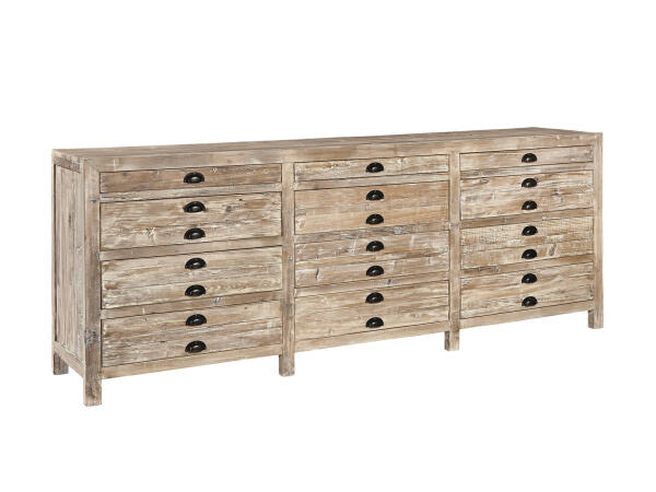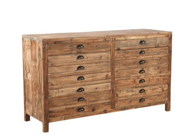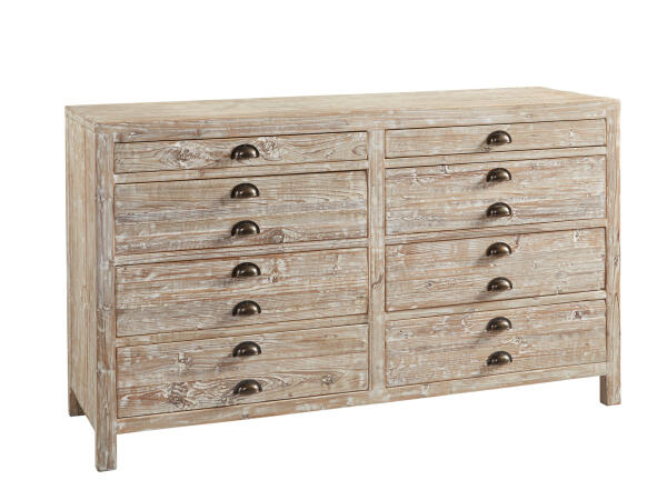 Timeless design is created in solid reclaimed pine, and features cup pulls on the functional dovetailed drawers. Mindful of practicality,
