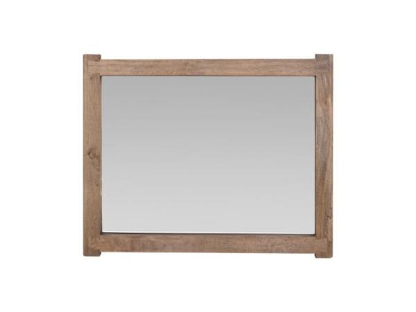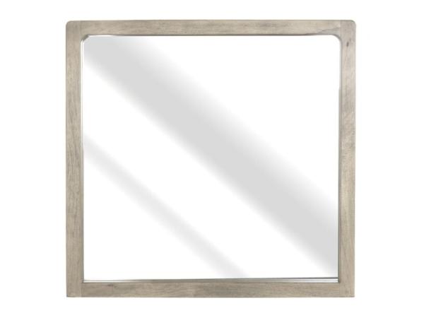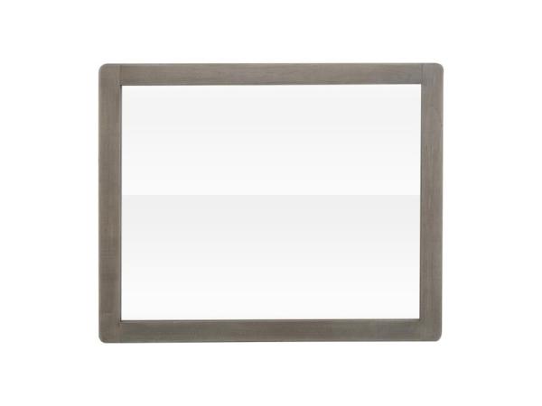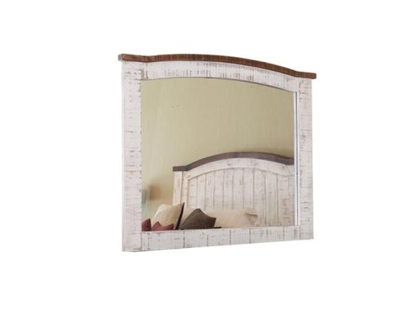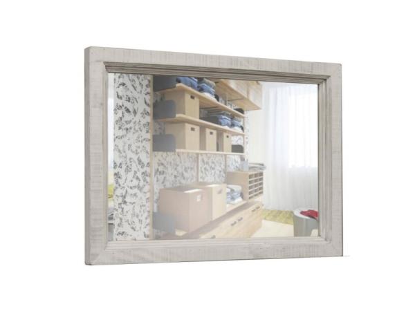 This River Place mirror features Pine solids, a distressed Riverstone White finish, a wide canted frame with mitered corners, and a one-inch beveled edge. It includes bolt-on supports for attachment to a dresser.