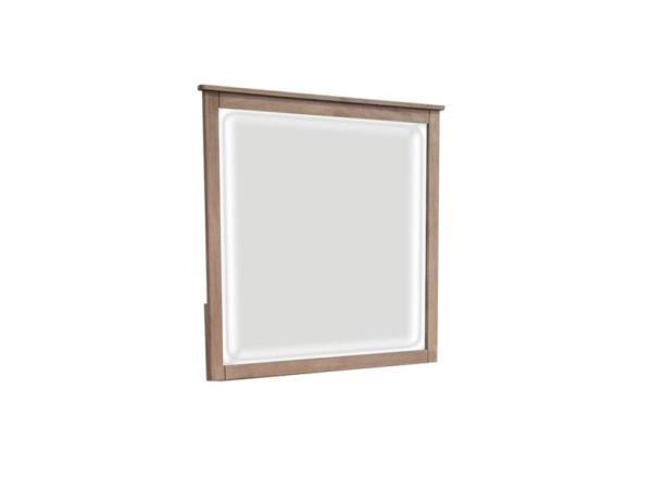 This contemporary landscape mirror features a Graystone finish with wide picture frame moldings and inset warm LED lights. Crafted from rubberwood solids, the lights can be controlled with a push-button.