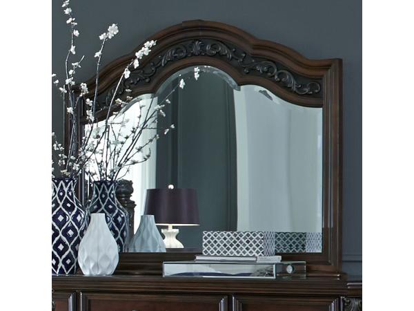 This elegant mirror features a softly arched cap rail and a 1-inch beveled edge for added depth and style. It includes bolt-on supports for easy attachment to a matching dresser.