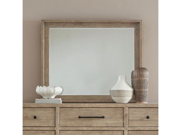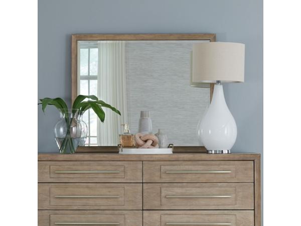 The Brentwood Landscape Mirror features Rubberwood solids with Split Heart White Oak veneers in a Sandstone finish. It includes softly shaped picture frame molding and a 1-inch beveled edge.
