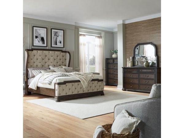 King Uph Shelter Headboard,King Uph Shelter Footboard,Shelter Bed Rails,8 Drawer Dresser,Curved Mirror,6 Drawer Chest