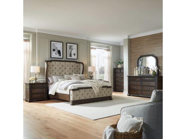 King Uph Shelter Headboard,King Uph Shelter Footboard,Shelter Bed Rails,8 Drawer Dresser,Curved Mirror,6 Drawer Chest,Nightstand w/ Charging Station