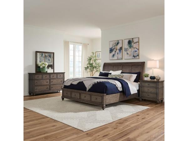 This complete King California sleigh bedroom set features a rolled headboard, high-low veneers, and planked accents for a classic look. The included nightstand offers modern convenience with a built-in charging station with USB-A and USB-C ports.