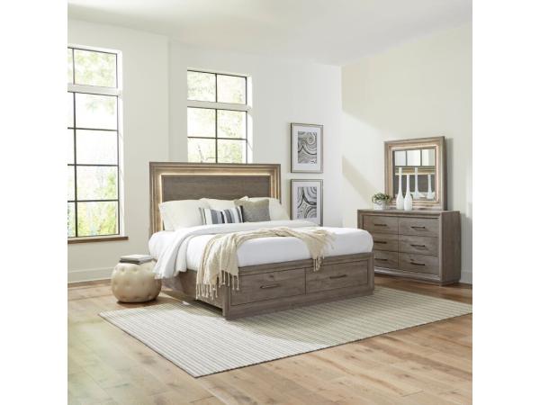 King Panel Headboard w/ Lights,King Storage Footboard,Storage Bed Rails,6 Drawer Dresser,Lighted Mirror