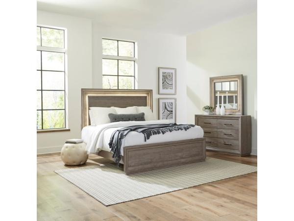 King Panel Headboard w/ Lights,King Panel Footboard,Panel Bed Rails,6 Drawer Dresser,Lighted Mirror