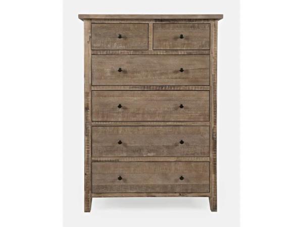 This Magnolia Manor 5-drawer chest is crafted from Poplar solids and White Oak veneers with a Weathered Bisque finish. It features felt-lined top drawers, cedar-lined bottom drawers, and fully stained interiors.