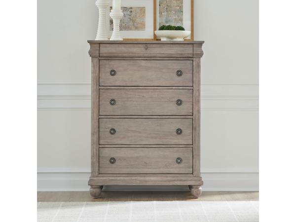 This urban-styled 5-drawer chest features a cobblestone finish, bottom case dust proofing, and picture-framed drawer fronts with canted molding. It is anchored by a tapered leg base and accented with antique brass hardware.