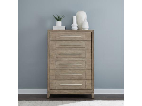 This Brentwood 6-drawer chest is made from Rubberwood solids and Split Heart White Oak veneers with a Sandstone finish. It features soft-closing drawers, a felt-lined top drawer, a cedar-lined bottom drawer, and a floating base with saber feet.