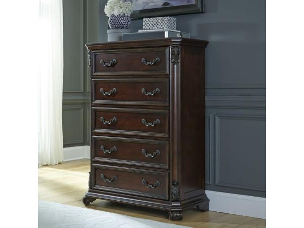 This luxurious 5-drawer chest, crafted from rubberwood solids and birch veneers, offers elegant European style with a cognac finish. It features fully stained interior drawers, felt-lined top drawers, and detailed acanthus leaf overlays.