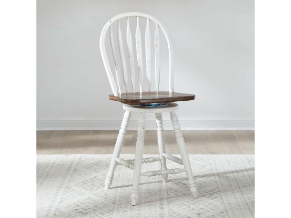 This Windsor swivel counter chair, crafted from Rubberwood solids, features an antique white and antique honey finish with an arrow back design. It includes a swivel saddle-shaped seat for comfort, multi-turned splayed legs, and nylon glides to protect fl