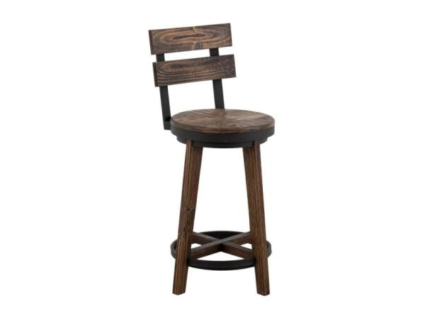 This Magnolia Manor counter height chair features a spindle back and a wooden saddle swivel seat, supported by turned legs with nylon glides. It is crafted from rubberwood solids with an antique white and weathered bark finish.