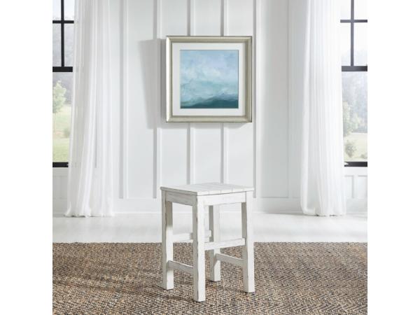 This console stool is crafted from pine solids with a distressed Riverstone White finish and features a planked wooden seat. It includes block legs with nylon glides to protect your flooring.