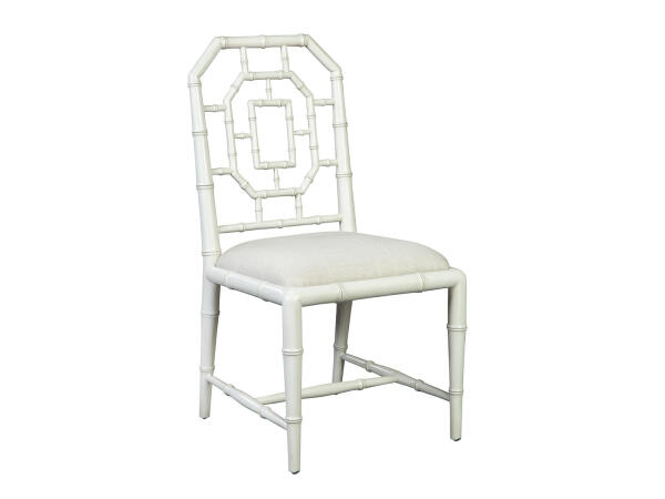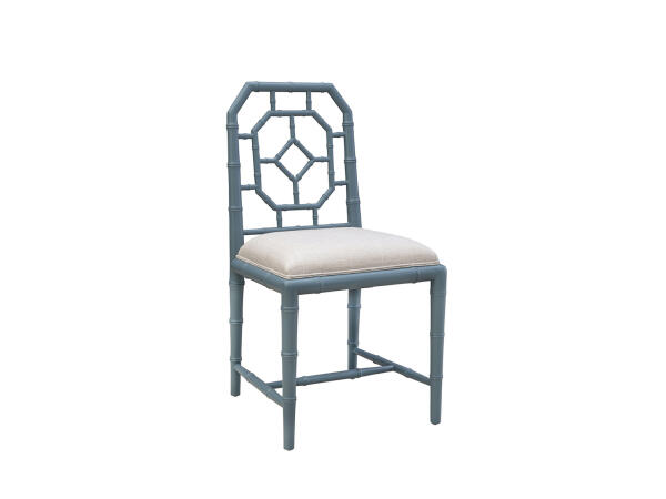 The Wilson Side Chair combines nature-inspired design with refined elegance. Its light blue wood frame, mimicking the texture of bamboo,