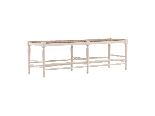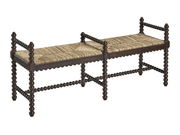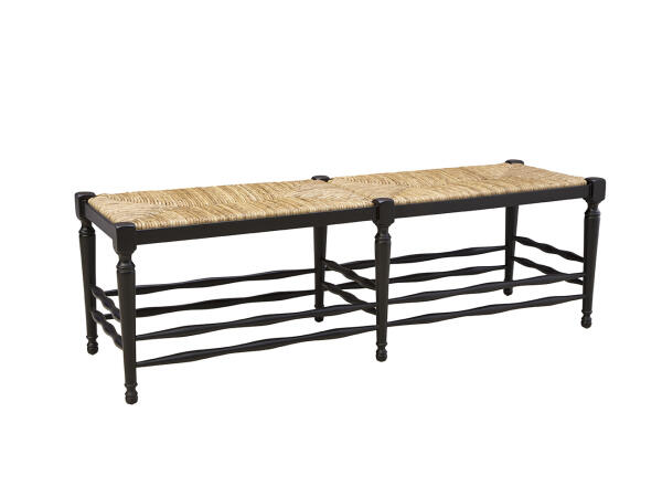 Quietly charming, this slender bench features delicate tapered legs and distinctive turned stretchers. Golden hand-tied rush adorns the seat. A