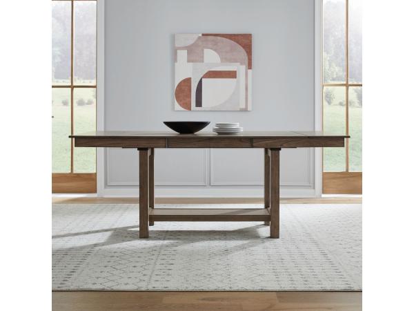 Crafted from Rubberwood solids and Mindy veneers in a Sandstone finish, this gathering trestle table top adds rustic-contemporary style to your dining space. It includes two 14-inch refectory leaves for easy expansion and must be paired with a compatible