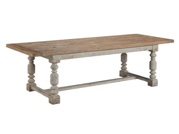 Stretching to a generous length, this reclaimed pine table is anchored by a slightly exaggerated chunky turned leg base. The