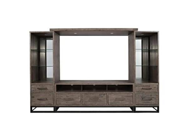 The perfect addition to any living room, media furniture with distressed wood and metal bases adds a touch of rustic