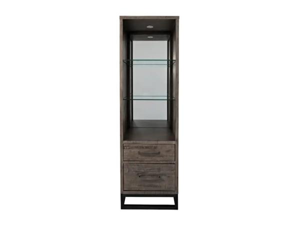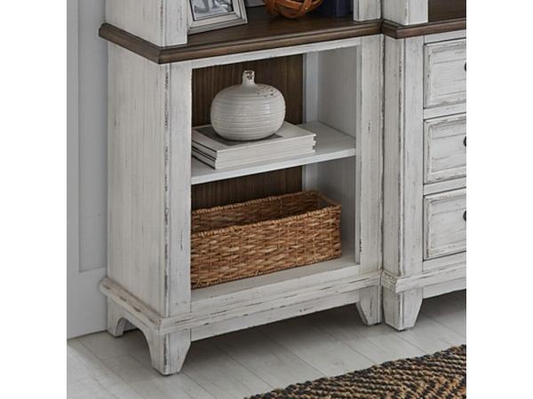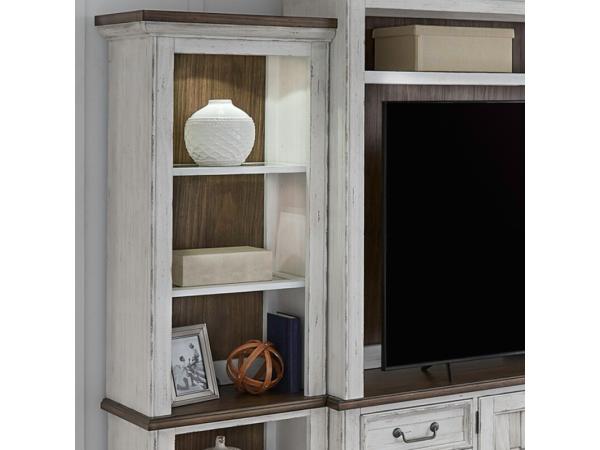 This River Place left pier top features Pine solids and veneers with a distressed two-tone Riverstone White and Tobacco finish. It includes two adjustable shelves, a glass insert top shelf with touch LED lighting, and wire management provisions.