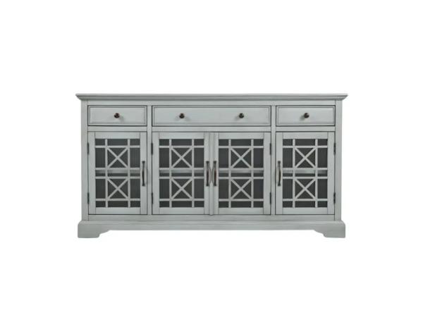 A versatile 74 inch accent TV console crafted from rubberwood solids and small cathedral split heart white oak veneers in a coastal fog finish. It features four wood-framed louvered doors, an exposed metal base, adjustable wood shelves, and wire managemen