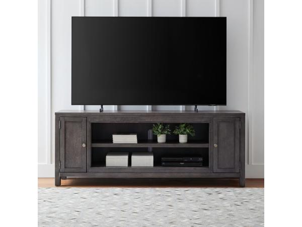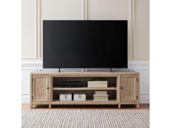 This 80-inch TV console is crafted from poplar, pine, and rubberwood solids with oak and pine veneers, featuring a Wire Brushed White and Charcoal finish. It includes two full extension drawers, two doors with adjustable shelves, and a center compartment