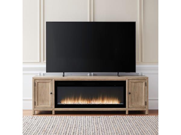 79 in. fireplace TV console available in multiple finishes. Measures 79 in. W x 18 in. D x 30 in. H.