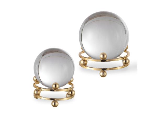 Crystal spheres elevated on steel bases finished in a polished, plated gold. Sizes: S-5x6x5, L-6x7x6