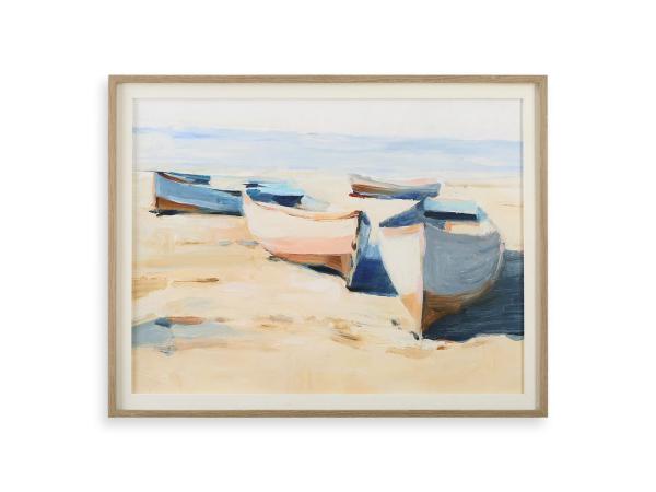 Beached Boats Framed Print features an abstract depiction of boats resting on serene sandy beach, complemented by a light wood-stained