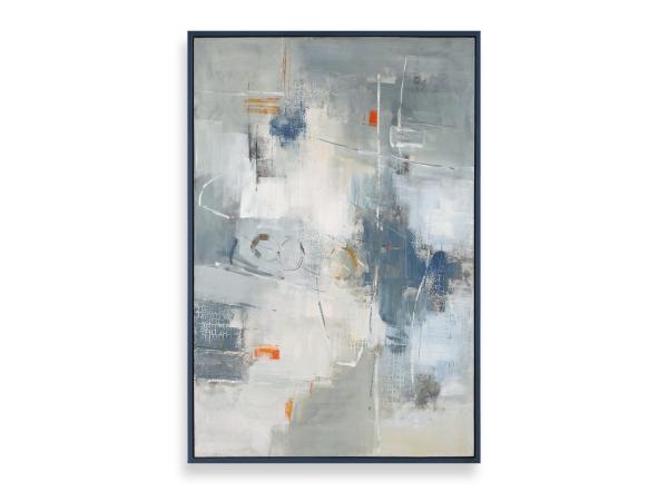 Shades of blue with splashes of raw umber and olive set on a white dove background make up this abstract