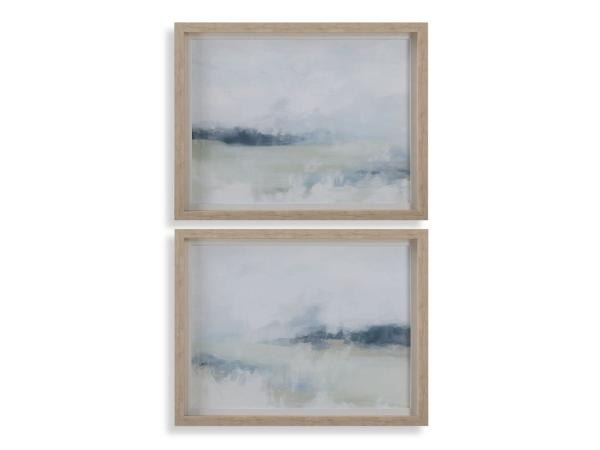 These tranquil landscape prints are shown under glass featuring watercolor shades of navy blue and sage. Each print is accented