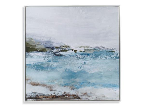 Made up of a bright color palette featuring shades of blue and green and surrounded by a gold gallery frame,