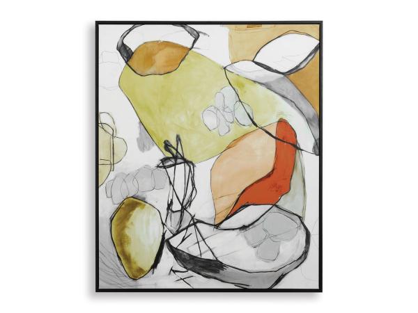 Featuring an giclee on canvas in shades of cheerful yellow and orange contrasted with charcoal gray and black and finished