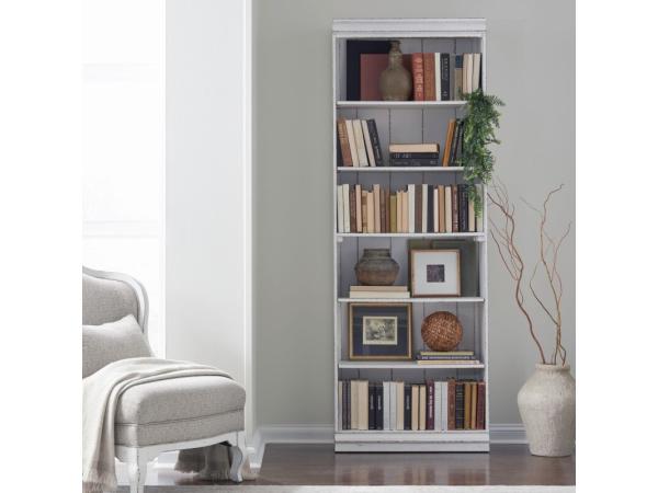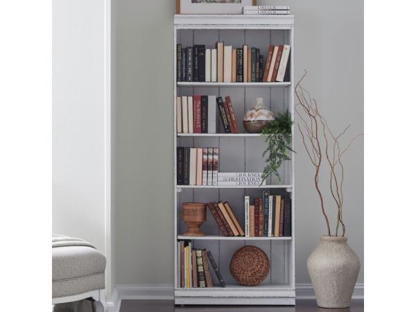 The Magnolia Manor 84 inch bookcase offers five fixed wood shelves and a planked back panel. Crafted from Rubberwood solids with White Oak and Birch veneers, it features an Antique White finish with heavy distressing and a heavy top crown.