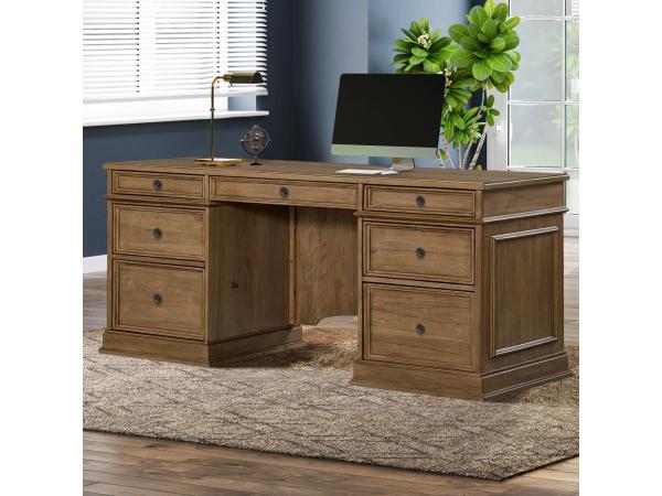This Sonoma Road desk/credenza top features two full extension drawers and a flip-down keyboard tray. It is crafted from poplar solids with cathedral hickory veneers in a weathered beaten bark finish.