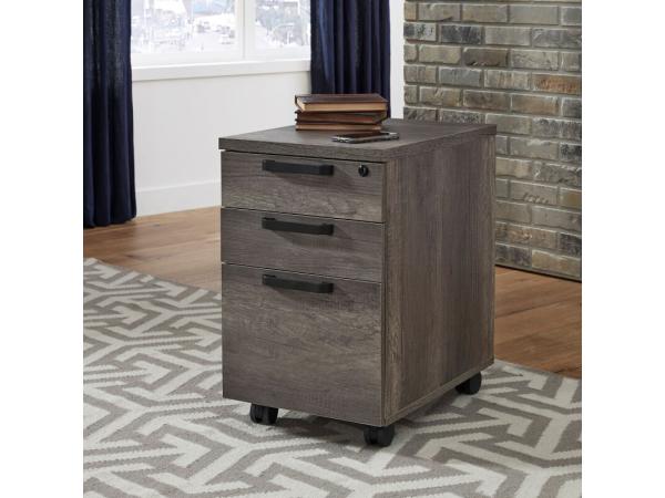 The Tanners Creek file cabinet, made from a rubberwood solid frame and scratch-resistant melamine, features a greystone finish. It includes three full extension drawers, a locking lateral file drawer for secure document storage, and mobile casters for eas