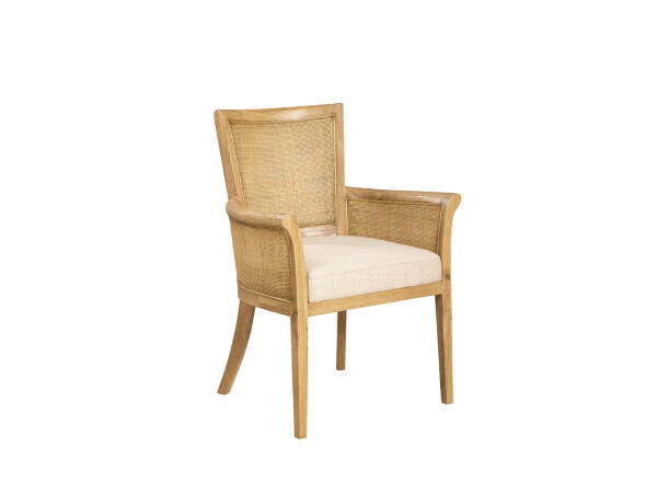 Introducing the Natural Gimble Arm Chair: crafted from a solid wood frame, this chair boasts a light brown finish that