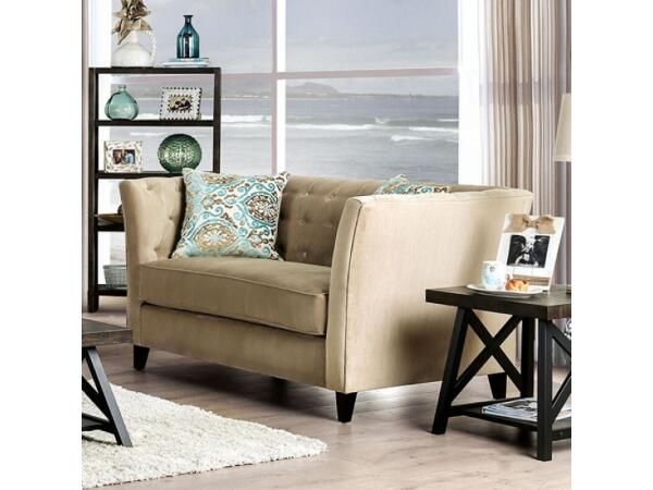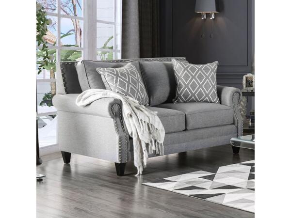 This sofa set is truly unique in its use of camelback armrests. The nailheads dot along the trim and accentuate