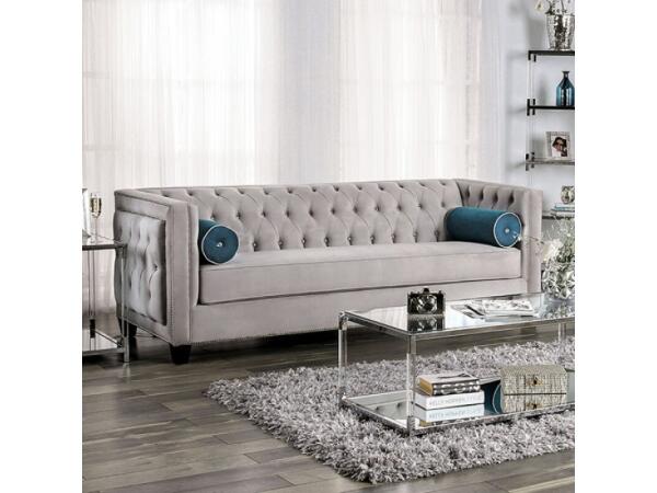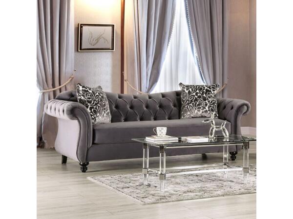 A touch of the chesterfield design is felt in this button tufted sofa set. The curl of the wedge arms