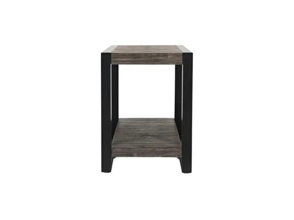 Crafted from poplar solids and oak veneers with a rustic brown oak finish, this chair side table features an appealing planked top and tapered legs. It provides one drawer with antiqued brass hardware and two shelves for storage and display.