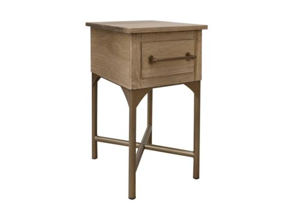 This chairside table features poplar solids, birch veneers, and polished metal with a Bleached Sand finish, and an inset wood top with polished metal trim. It offers two open bottom shelves for versatile storage and display.