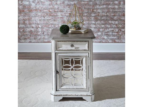 Crafted from poplar solids and white oak veneers with a weathered bisque finish, this chair side table features a fancy face veneer top and a storage drawer. It includes a door with an antiqued mirror and an adjustable wood shelf for versatile storage.