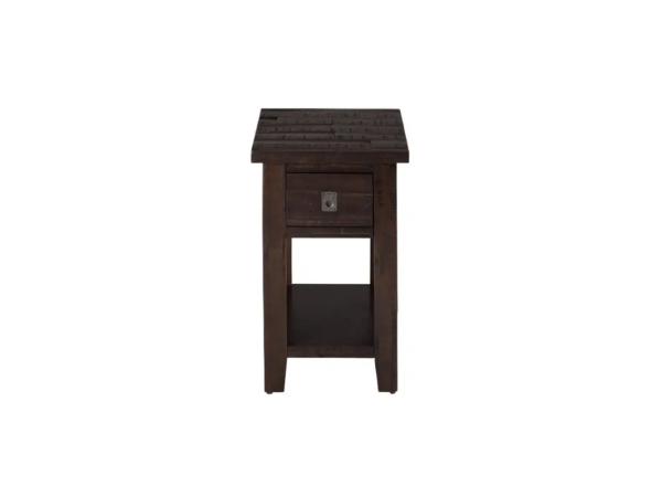 The square chairside table is crafted from Pine solids and Rustic Birch veneers with a Cobblestone Brown finish. It features block raised legs, a planked top with a high-low veneer pattern, and an open bottom shelf for storage.