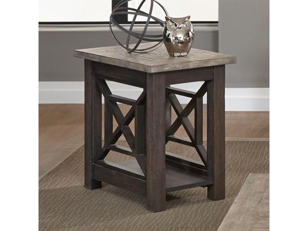 The Heatherbrook chair side table features poplar solids and acacia veneers with a charcoal and ash finish and two-tone top. It offers a bottom shelf for storage, open grid end panels, and a block leg design.