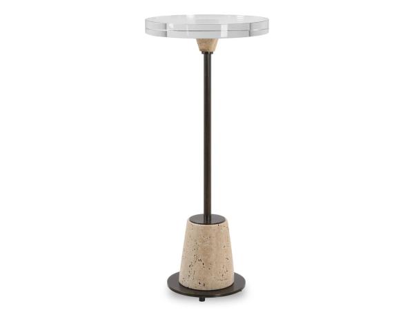 The Arthur accent table features a thick crystal top, honed and unfilled travertine, paired with bronze finished iron. The fusion