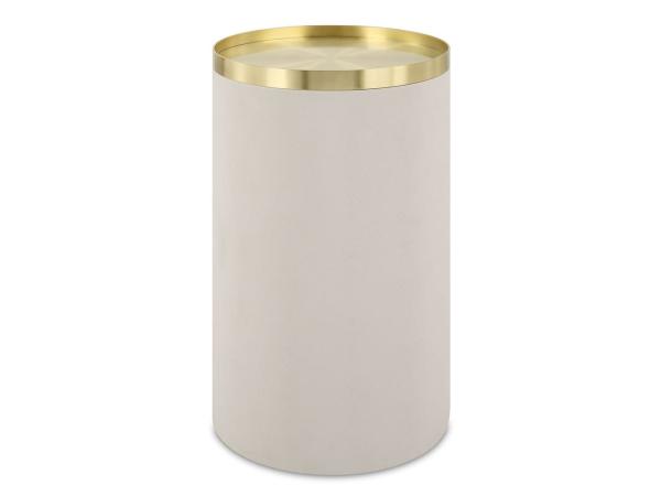 Featuring a lipped top in iron with a beautiful plated brushed brass finish, atop a base wrapped in white faux