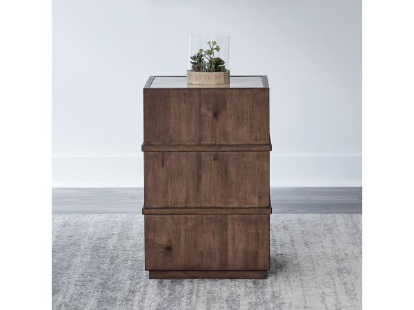 Crafted from poplar solids and cedar veneers with a nutmeg finish, this chair side table features a four-way fancy face veneer top. It includes a pull-out drink shelf and two additional shelves for practical storage.
