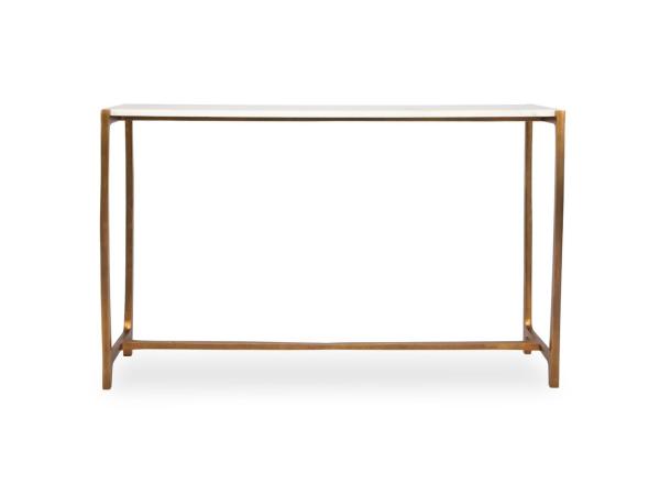With understated sophistication, the Affinity Console table complements with ease. Featuring a shapely cast aluminum base in antique gold that