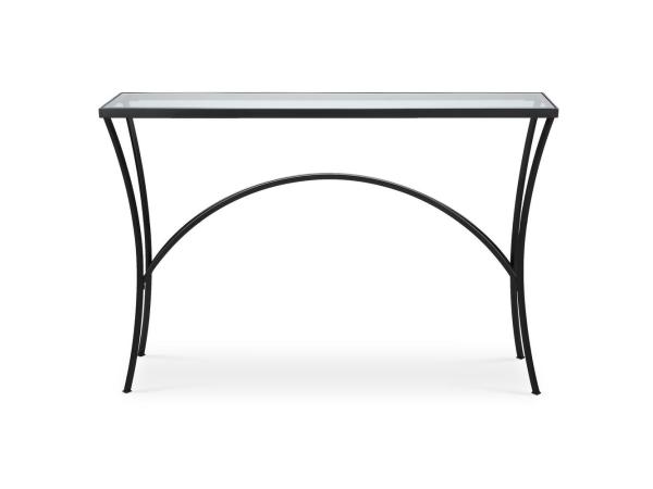 Gracefully arched hand forged metal finished in sleek satin black. Top is clear beveled tempered glass.