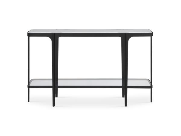 Boasting sleek, clean lines with gently curved corners and a satin black iron frame, this uniquely designed console table brings