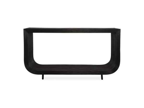This console table seamlessly blends modern design with natural elements. The console features sleek natural rattan in a black finish